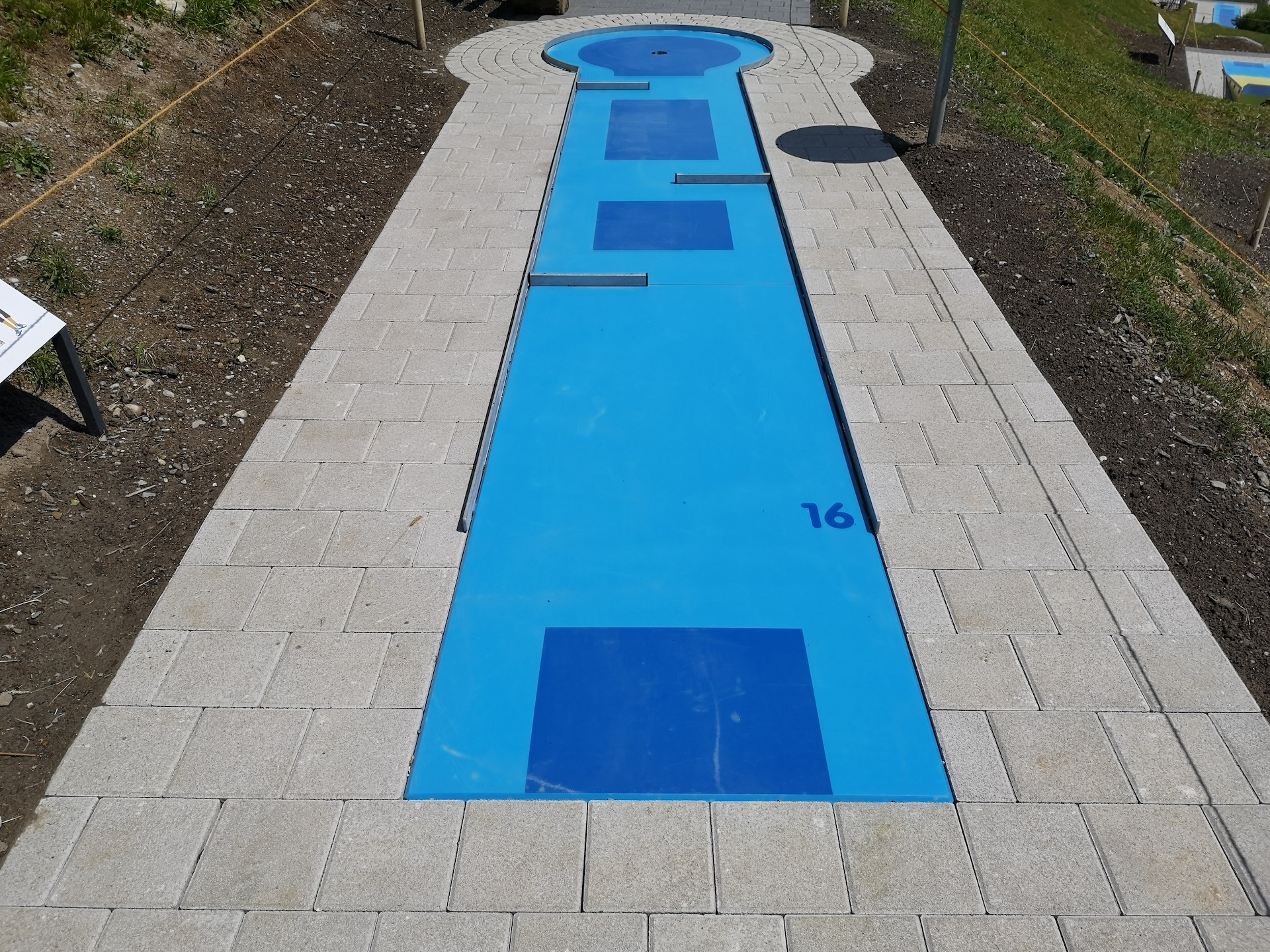 Betonhindernisse sind in einem Guss mit den Bahnen gefertigt. Banden in Flachbanden-Ausführung. Alle Metalleinbauteile (Bande, Hindernisse) sind verzinkt. Die eingearbeiteten Beton-Hindernisse haben eine optisch ansprechende farbige Beschichtung aus zweikomponentigem Polyurethan.