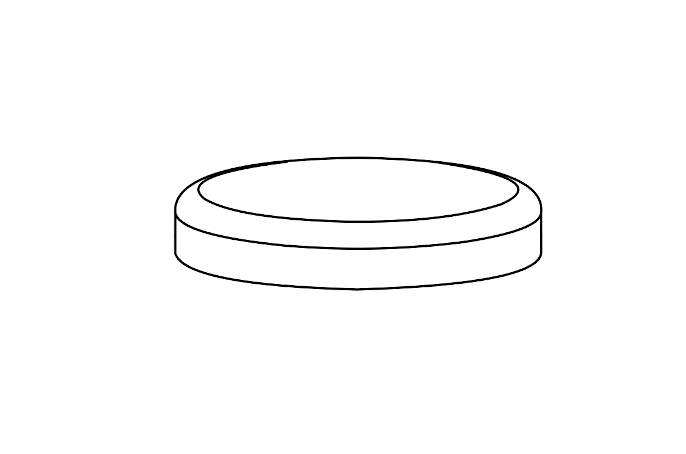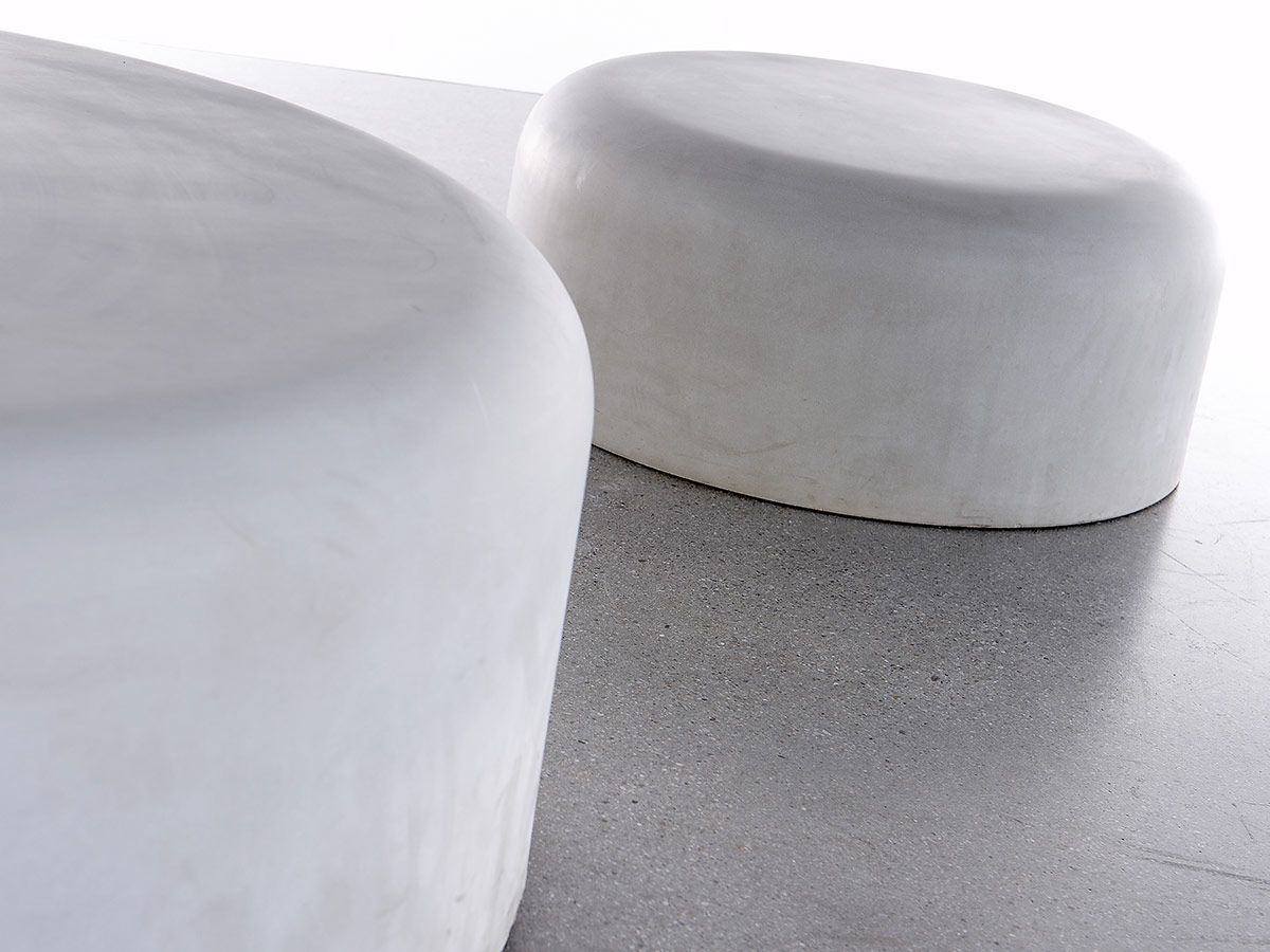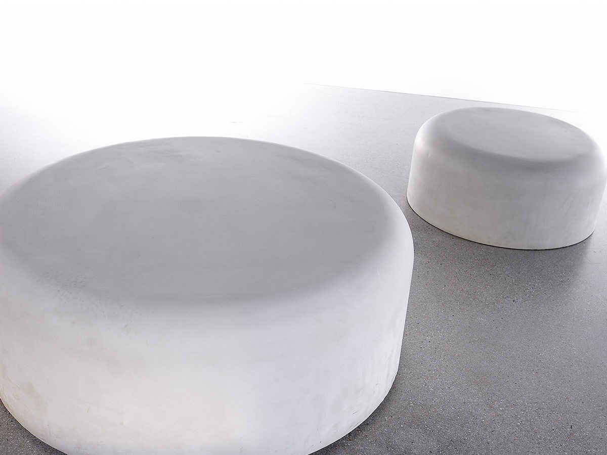 Sitzbubble aus Glasfaserbeton als Hohlkörper, oberseitig umlaufende Kante gerundet mit Radius 10 cm, Wandstärke ca. 3 cm.