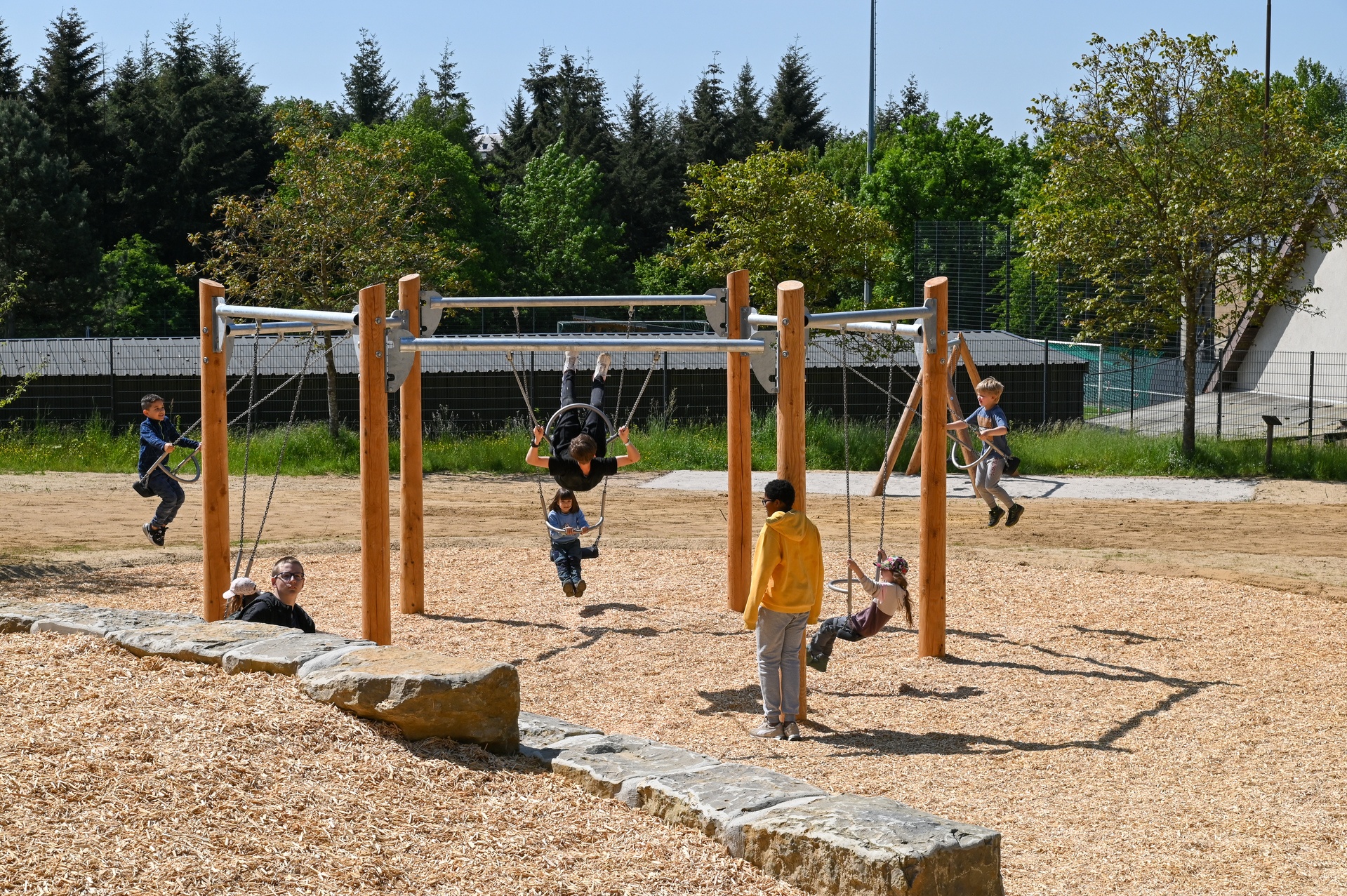 Um der Sechseckschaukel einen neuen formalen Ausdruck zu verleihen, haben wir die Spezialausführung mit dem Querbaum aus Stahl entwickelt. Die technisch ausgeklügelte Eckverbindung trägt zusätzlich zur Stabilität der Gesamtkonstruktion bei. Die Schaukel bietet neben der reinen Freude am Schwingen zudem einen hohen Kommunikationswert. Die Spielenden können aufeinander zuschaukeln, sich dabei ansehen, oder, und das ist ein besonderer Spass, sich mit den Füssen berühren. Es hat sich gezeigt, dass Heranwachsende die Sechseckschaukel gerne als alternatives Sitzgerät für ein buchstäbliches „Herumhängen“ nutzen.