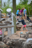 Die Wasser- und Wippfluter erinnern an Regenrinnen. Durch die tiefgezogene Form können sie eine hohe Wassermenge aufnehmen, vorausgesetzt, jemand betätigt kräftig die Pumpe. So können Schwall, Fluten und schnelles Strömen erlebt werden.