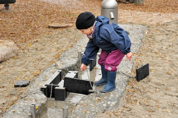 Die vielfältigen Möglichkeiten, den Wasserfluss umzulenken, ihn schneller oder langsamer fliessen zu lassen oder das Wasser zu stauen, bereitet Gross und Klein gleichermassen Freude. Dem Betrachter eröffnen sich durch die spielend entstehenden Formen unterschiedliche Sinneseindrücke.