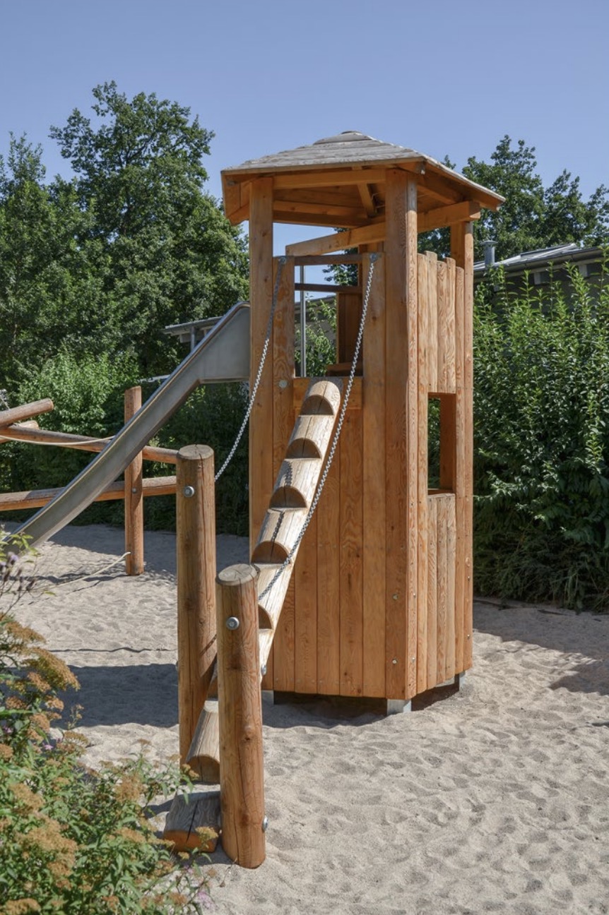 Die Schwarten der Turmwände werden von Hand weissgeschält und behalten dadurch die natürliche Struktur des Holzes bei. So lassen sich die Äste erspüren und die Maserung bleibt sichtbar. Uns ist die natürliche Oberfläche wichtiger als der Kostenvorteil einer industriellen Fertigung mit genormten Bauteilen. Die Spielräume unserer Türme sind auch ein „Häuschen“-Angebot und entsprechen in ihrer Grösse dem kindlichen Raumgefühl. Fest installierte Zwischenböden bilden heimelige Räume, zum Teil mit Durchschlupf. Eine Sitzbank im unteren Raum lädt dazu ein, sich zu treffen und miteinander zu plaudern. Kinder fühlen sich darin geborgen und geschützt. Spannend wird es aber auch, wenn man im Turm in das nächste Stockwerk hinaufklettert. Die Anbaumöglichkeiten verschiedener Kombinationselemente wie Rutsche, Hängebrücke, Kettensteg usw. machen den Turm besonders attraktiv.