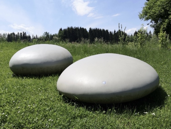 Device made of non-impregnated mountain larch, sawn timber heart-cut. Feet Ø 75 mm, seat made of planks, 14 cm thick.