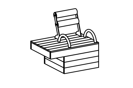 Device made of non-impregnated mountain larch, sawn timber heart-cut. Hot-dip galvanised substructure, stainless steel handles and backrest, EPDM upholstery, standard colour yellow.