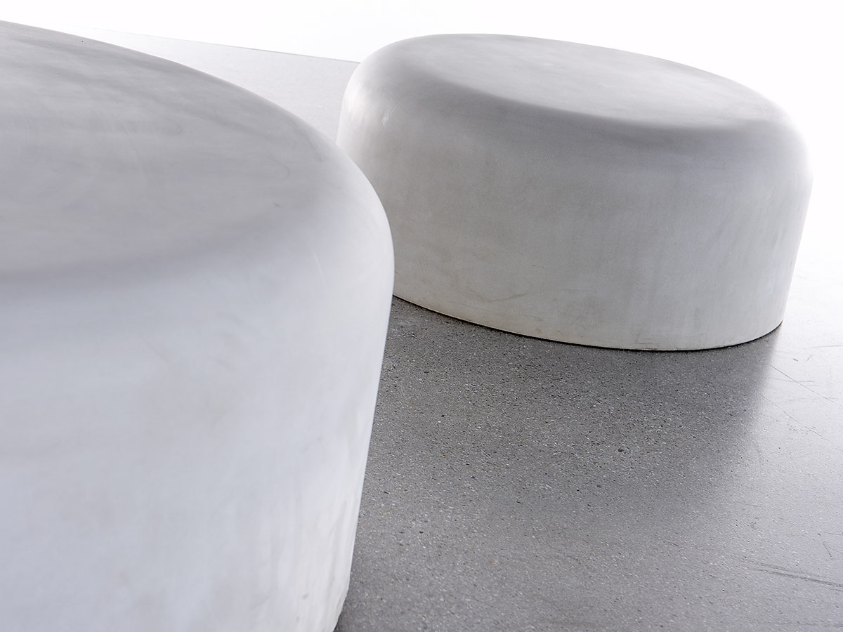 Sitzbubble aus Glasfaserbeton als Hohlkörper, oberseitig umlaufende Kante gerundet mit Radius 10 cm, Wandstärke ca. 3 cm.