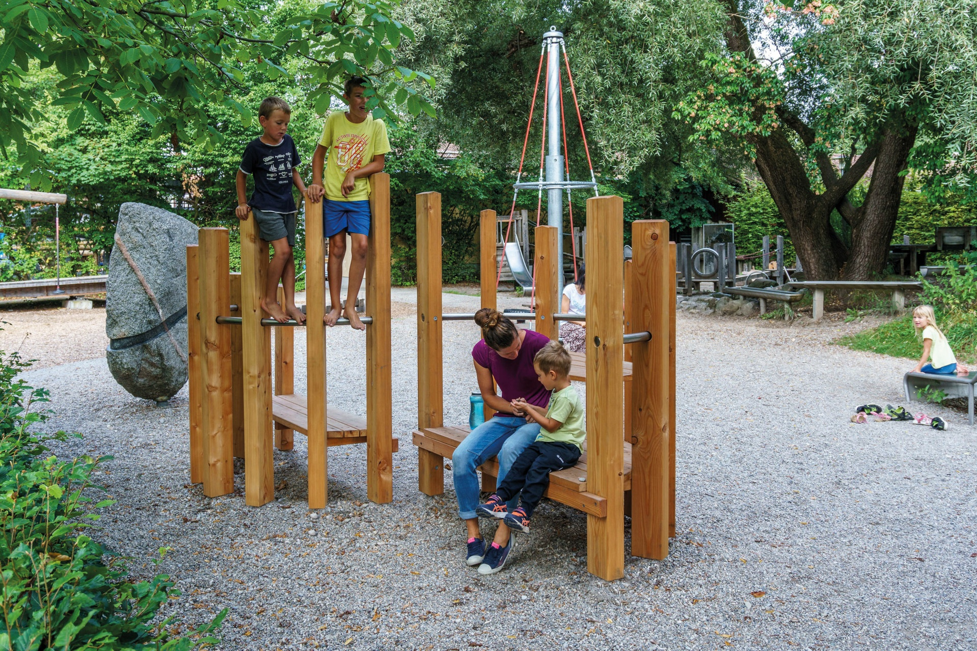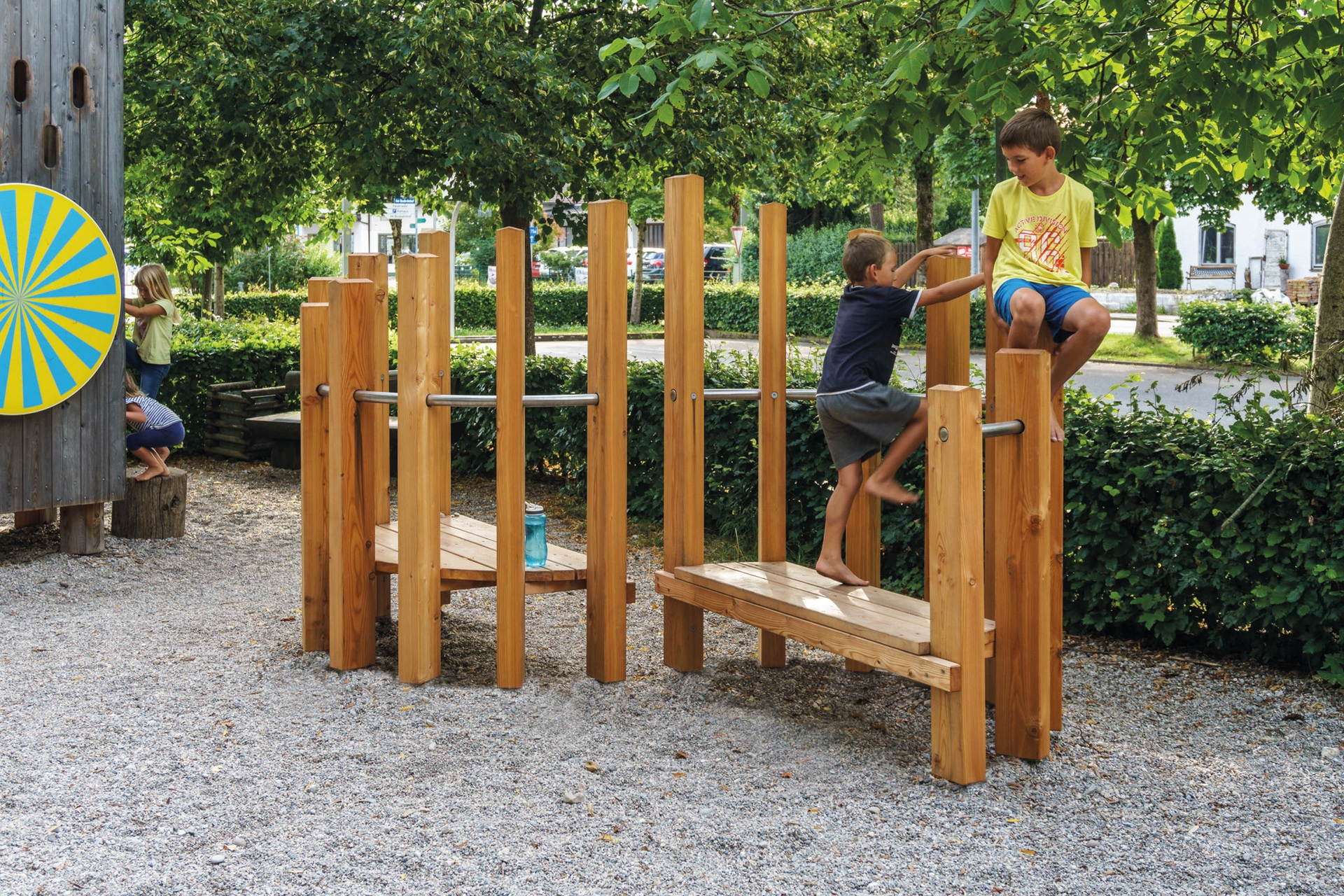 Gerät aus nicht imprägnierter Gebirgslärche, mit schrägem Hirnholzabschnitt (Holzschutzmassnahme), Schnitthölzer herzgetrennt. Verbindungsstange aus rostfreiem Edelstahl.