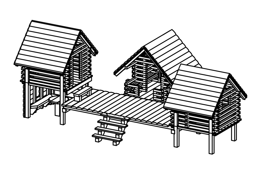 The small village of timber houses provides a friendly atmosphere in the play area. The different play levels with their basic furnishings like a table and benches stimulate house and cave games while the wide platform is a meeting point for neighbourhood contacts. The steps are good for sitting and talking. Naturally the active children use the house combination for running about, chasing and climbing.