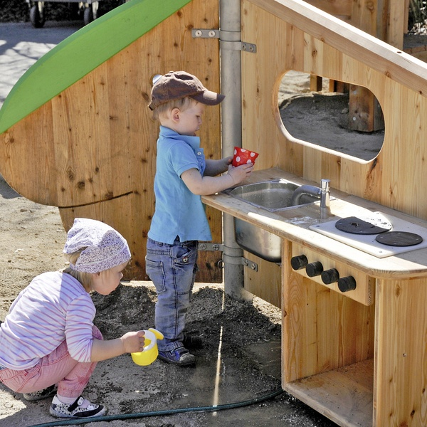 The caterpillar is a friendly play offer for small children. The harmonious appearance of the figure and the way in which it is possible to play from both sides offer a lively and pleasant basis for smaller playing spaces. The space partitions promote communicative play, but also make it possible to create borders and divisions of the play areas. This caterpillar type is equipped with a sun sail and an opportunity for role-playing games such as “kitchen”. The latter can also be fitted with a water connection via a garden hose.