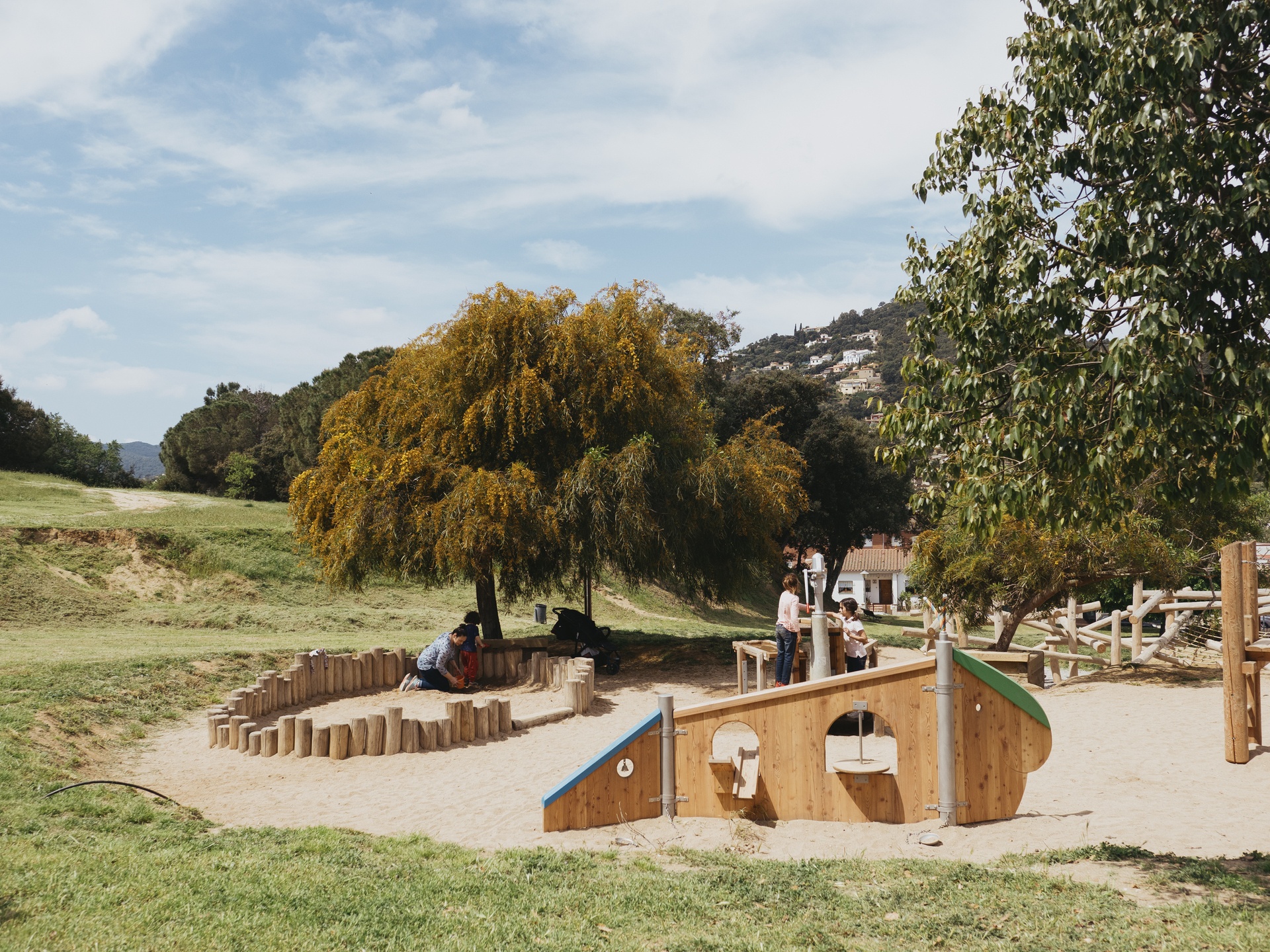 The caterpillar is a friendly play offer for small children. The harmonious appearance of the figure and the way in which it is possible to play from both sides offer a lively and pleasant basis for smaller playing spaces. The space partitions promote communicative play, but also make it possible to create borders and divisions of the play areas. This caterpillar type is equipped with a turntable, a two-way channel and shovels.