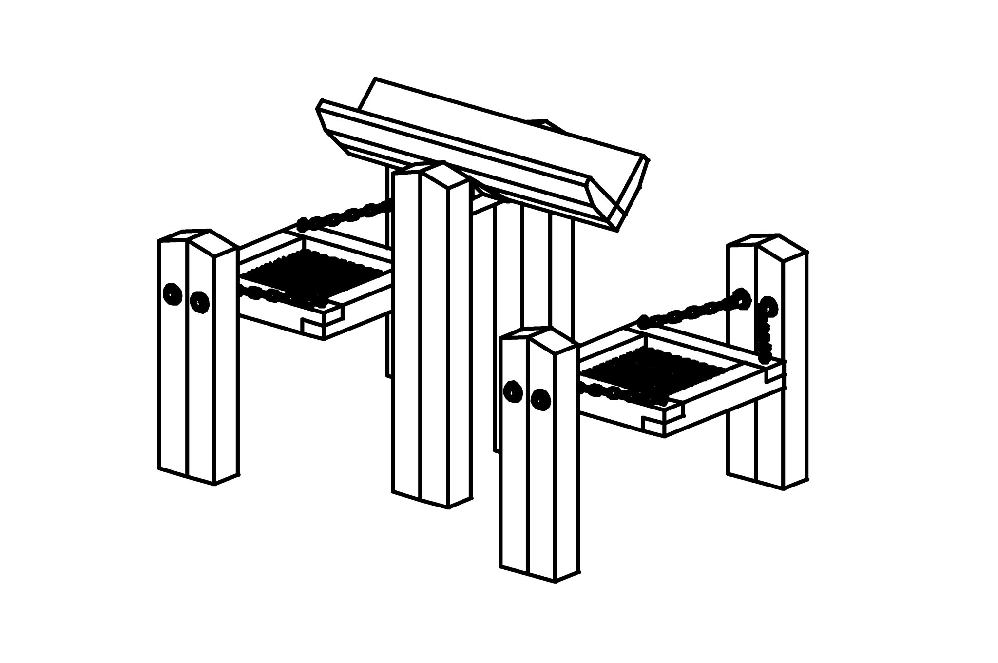 Unit made of non-impregnated mountain larch, with slanted end grain (wood protection measure), sawn timber heart-cut. Multi-layer board made of three-layer board (3 cm) or five-layer board (4 cm), high dimensional stability, weatherproof glued in accordance with DIN EN 13353:2011. Profiled disc for optimum pressure distribution and protection against water penetration. Retractable two-part screws. Hot-dip galvanised steel chains (V2A / V4A for an extra charge) welded before galvanising, short-linked, without eyelets on the connecting parts, easy to replace and shorten. High-quality roller bearings made of chrome steel or stainless steel for rotating elements, low-maintenance, easy to replace, sealed. Shaking sieves made of V2A. Sand rocker mounted in rubber torsion bushes.