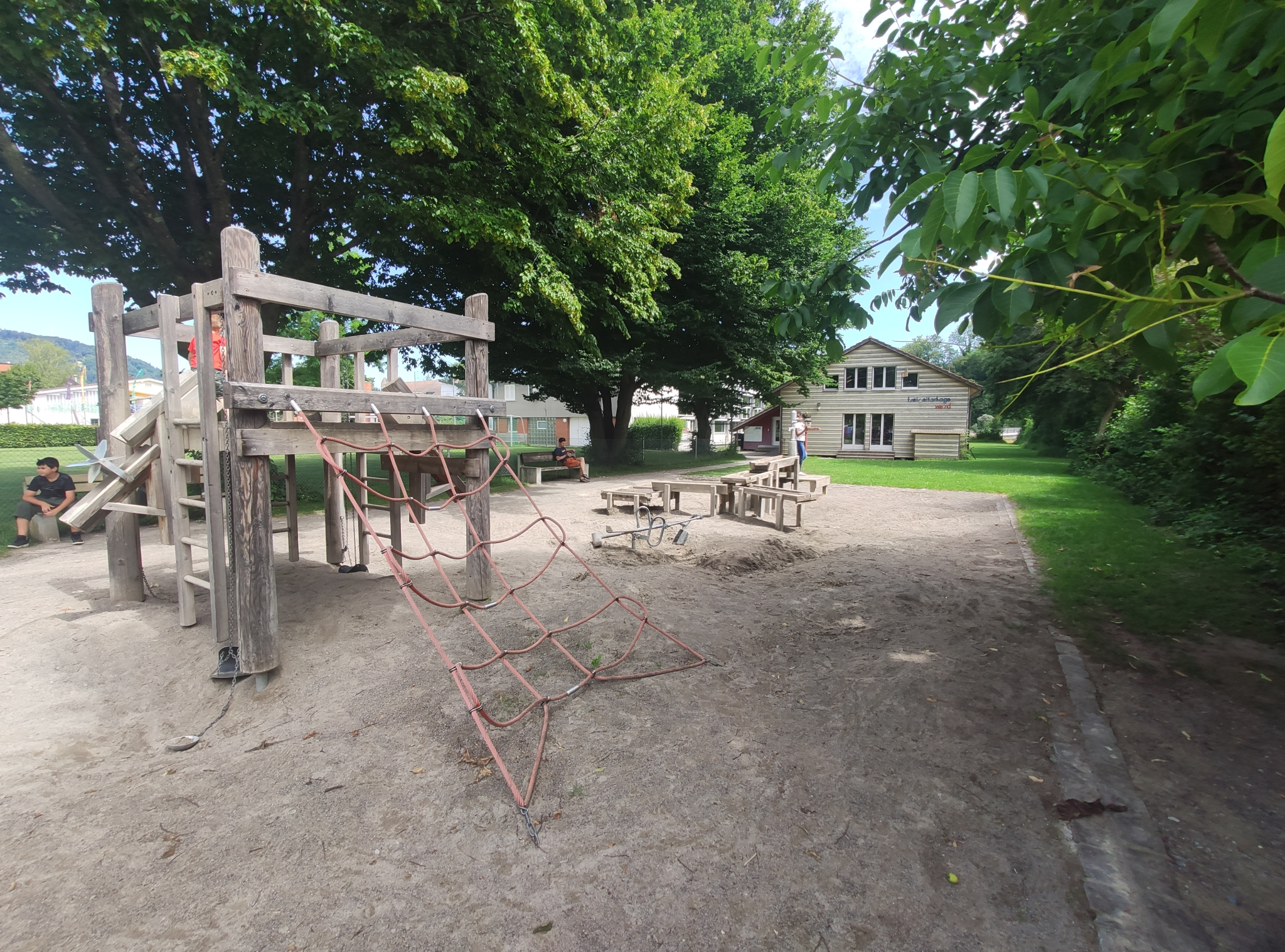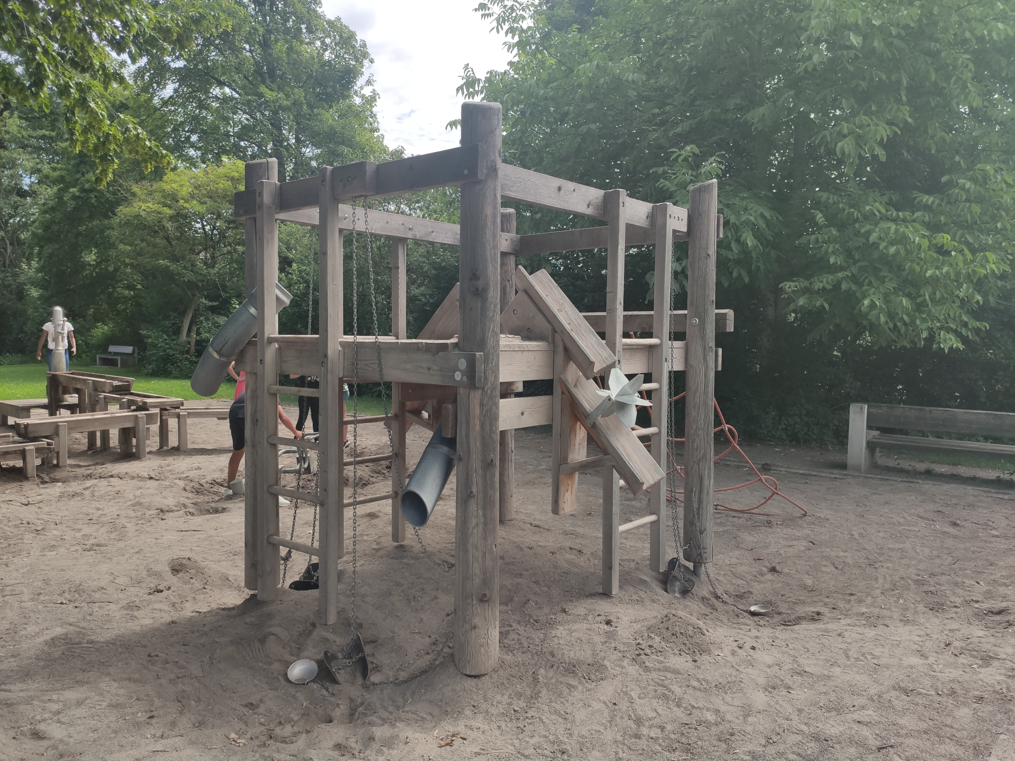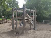 Device made of non-impregnated mountain larch, palisades white-peeled, with slanted end grain (wood protection measure), sawn timber heart-cut. Tongue and groove planks made of 4 cm solid wood, highly resilient, no trickling through. Climbing rungs made of hardwood (ash) Ø 4.2 cm, milled, mortised, secured against twisting. Richter Hercules rope, Ø > 20 mm, made of galvanised six-strand steel rope, covered and glued with polyester yarn, with very good abrasion resistance, firm hold of the sheathing even in the event of punctual damage. S-connector, Ø 8.1 mm, made of high-quality stainless steel, rounded. Fixed cable connection. Hot-dip galvanised steel chains (V2A / V4A for an extra charge) welded before galvanising, short-linked, without eyelets on the connecting parts, easy to replace and shorten.
