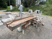 Unit made of non-impregnated mountain larch, sawn timber heart-separated. Tongue and groove planks made of 4 cm solid wood, highly resilient, no trickling through, sealed with sponge rubber.