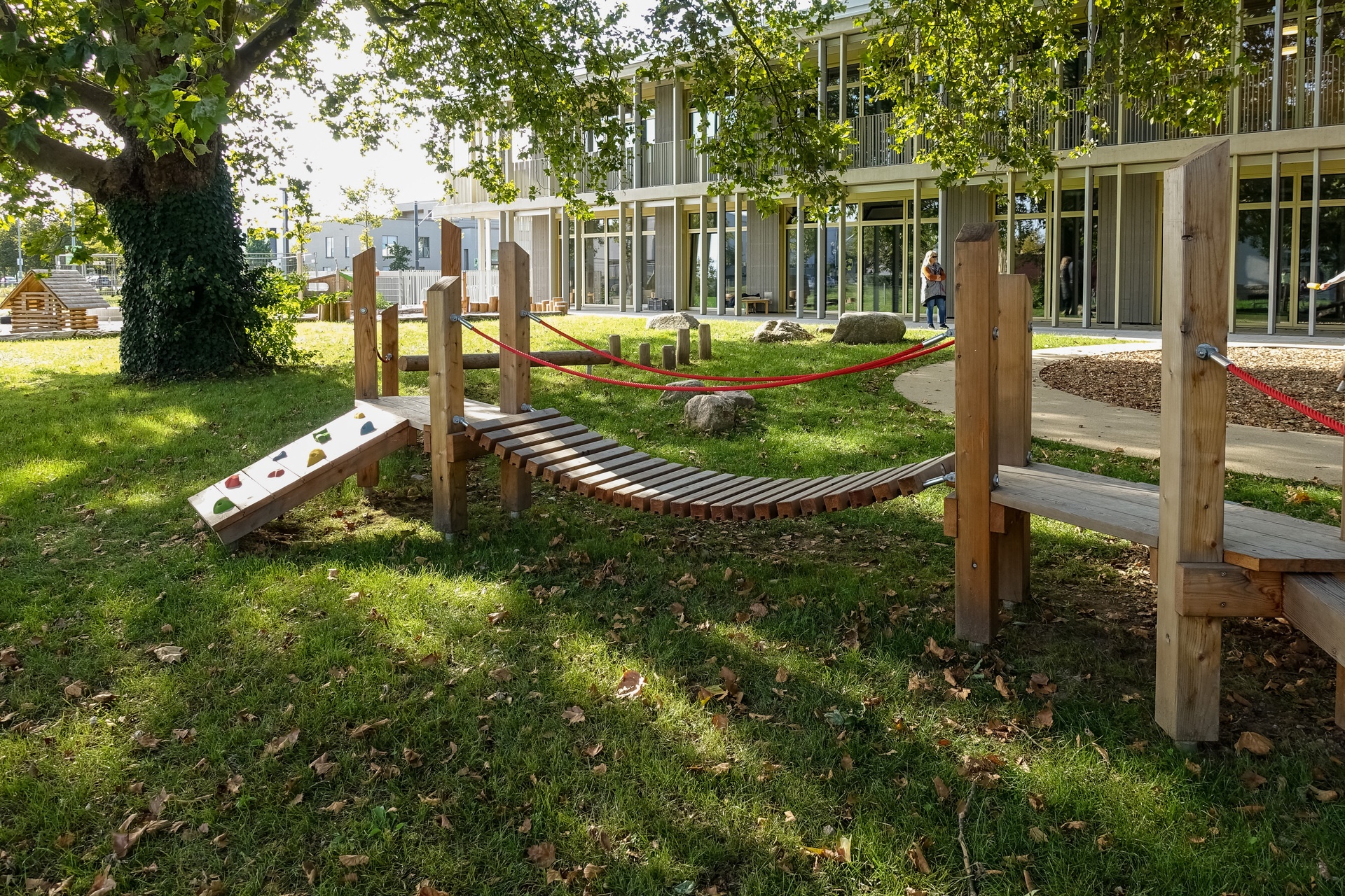 Appareil en mélèze de montagne non imprégné, avec section de bois de bout inclinée (mesure de protection du bois), bois de sciage séparé par cœur. Dosses (4-5 cm) pelées à la main en blanc, la surface naturelle de l'arbre reste perceptible et palpable. Planches à rainure et languette en bois massif de 4 cm, très résistantes, pas de ruissellement. Câble Hercule de Richter, Ø > 20 mm, en câbles d'acier galvanisés à six torons, enrobés et collés avec du fil polyester, très bonne résistance à l'abrasion, maintien ferme de la gaine même en cas de dommages ponctuels. Rondelle profilée pour une répartition optimale de la pression et une protection contre les infiltrations d'eau. Vis en deux parties pouvant être resserrées. Mouvements de va-et-vient avec palier lisse en métal fritté, autolubrifiant. Couleur de corde standard rouge