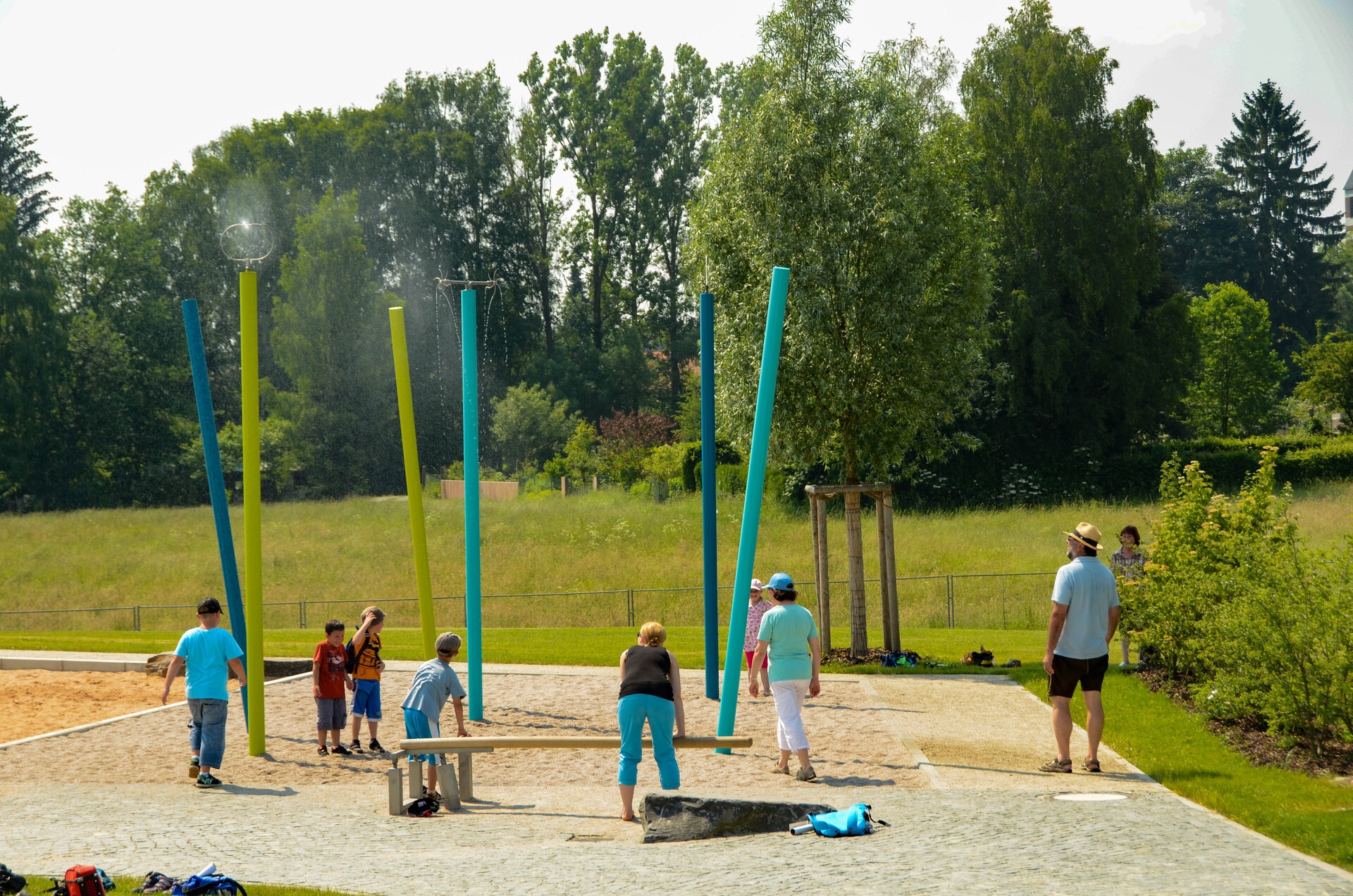La disposition des mâts et des pompes doit permettre d'observer les effets de fontaine pendant le pompage. Les mâts à faible rayon de jet devraient être placés plus près du bord de la place et ceux à grand rayon plus loin. Les distances entre et vers les mâts devraient être de 3 à 6 m, et de 10 m maximum entre les mâts et la ou les pompes. L'important pour l'effet visuel est le rayonnement solaire et le contraste avec un arrière-plan plus sombre, comme des arbres ou des façades de bâtiment planes.