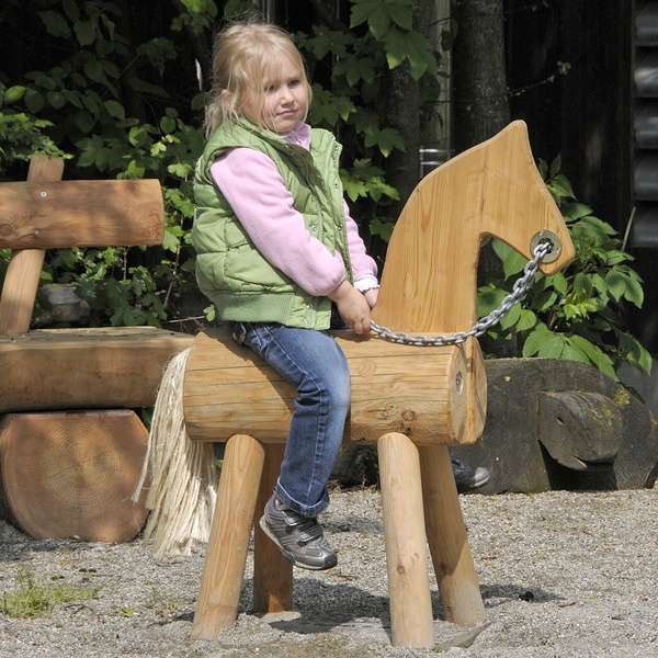 Corps du poney en mélèze de montagne écorcé non traité, jambes en rondins, tête en panneau 3 plis de mélèze de montagne (30 mm), Chaîne à maillons courts (6 mm).