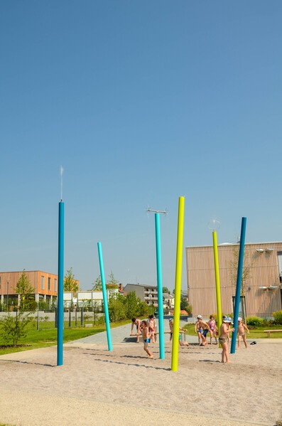 La forêt aquatique est un ensemble de mâts équipés de différents buses, pompes et vannes. Lorsque les enfants et les adultes jouent à pomper, l'eau est remontée dans les mâts à la force des muscles et peut être déviée par les vannes. Les buses et les rotors font en sorte que différentes figures apparaissent dans les éclaboussures et les chutes d'eau, figures qui ne cessent de se modifier lors du pompage.