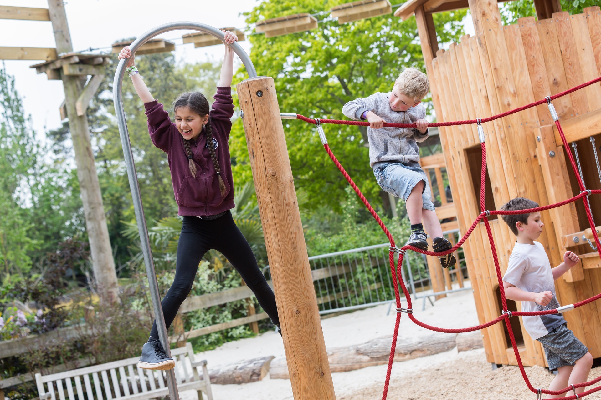 Appareil en mélèze de montagne non imprégné, palissades pelées blanches, avec section de bois de bout inclinée (mesure de protection du bois), corde Hercule de Richter, Ø > 20 mm, en câbles d'acier galvanisés à six torons, enrobés et collés avec du fil polyester, avec une très bonne résistance à l'abrasion, maintien ferme de la gaine même en cas de dommages ponctuels. Connecteur en S, Ø 8,1 mm, en acier inoxydable de haute qualité, arrondi. Raccord de câble fixe. Barre de glisse en V2A, grenaillé aux billes de verre, Ø 42 mm.