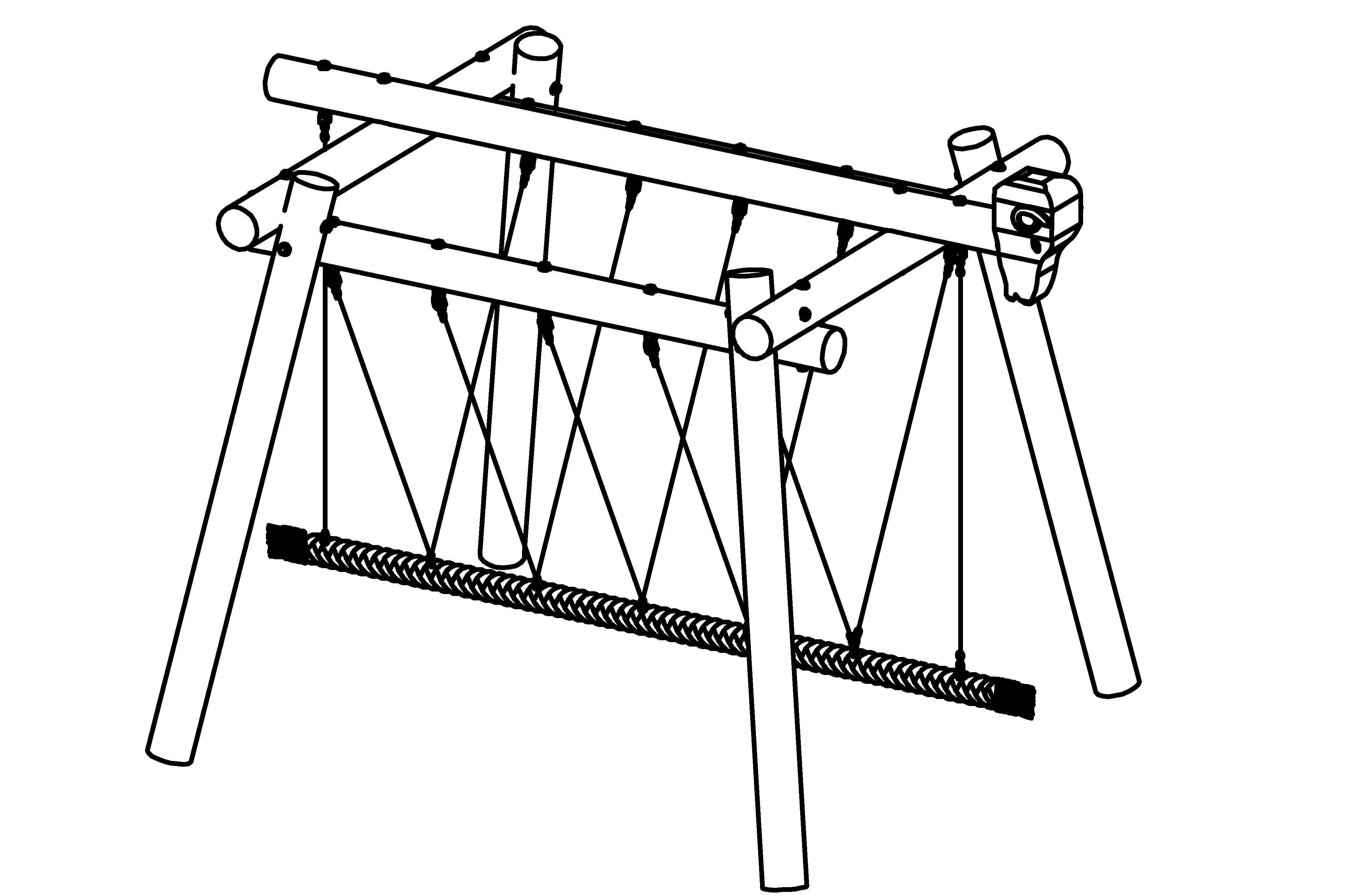 Apparecchio in larice di montagna non impregnato, palizzate con buccia bianca, giunto oscillante, zincato a caldo, con cuscinetto a strisciamento in metallo sinterizzato e girello integrato. Disco profilato per una distribuzione ottimale della pressione e una protezione contro le infiltrazioni d'acqua. Bulloni retrattili in due parti. Catene in V2A o V4A ad alta resistenza alla corrosione, a maglie corte, senza occhielli sulle parti di collegamento, facilmente sostituibili e accorciabili. Corda in PP Ø 150 mm con anima in acciaio zincato di 12 mm di spessore.