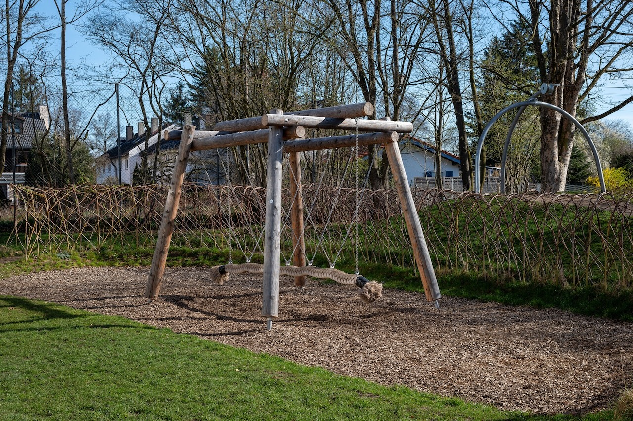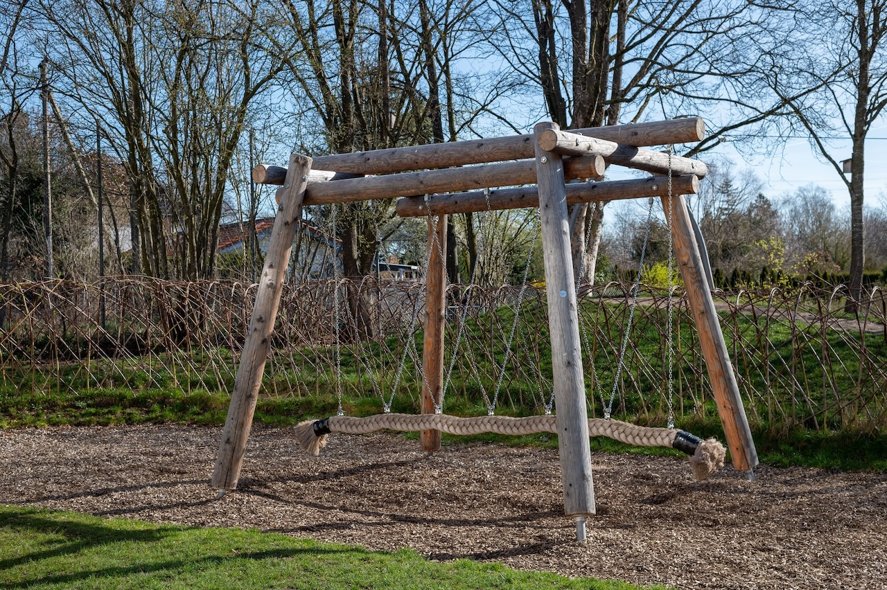 Apparecchio in larice di montagna non impregnato, palizzate con buccia bianca, giunto oscillante, zincato a caldo, con cuscinetto a strisciamento in metallo sinterizzato e girello integrato. Disco profilato per una distribuzione ottimale della pressione e una protezione contro le infiltrazioni d'acqua. Bulloni retrattili in due parti. Catene in V2A o V4A ad alta resistenza alla corrosione, a maglie corte, senza occhielli sulle parti di collegamento, facilmente sostituibili e accorciabili. Corda in PP Ø 150 mm con anima in acciaio zincato di 12 mm di spessore.