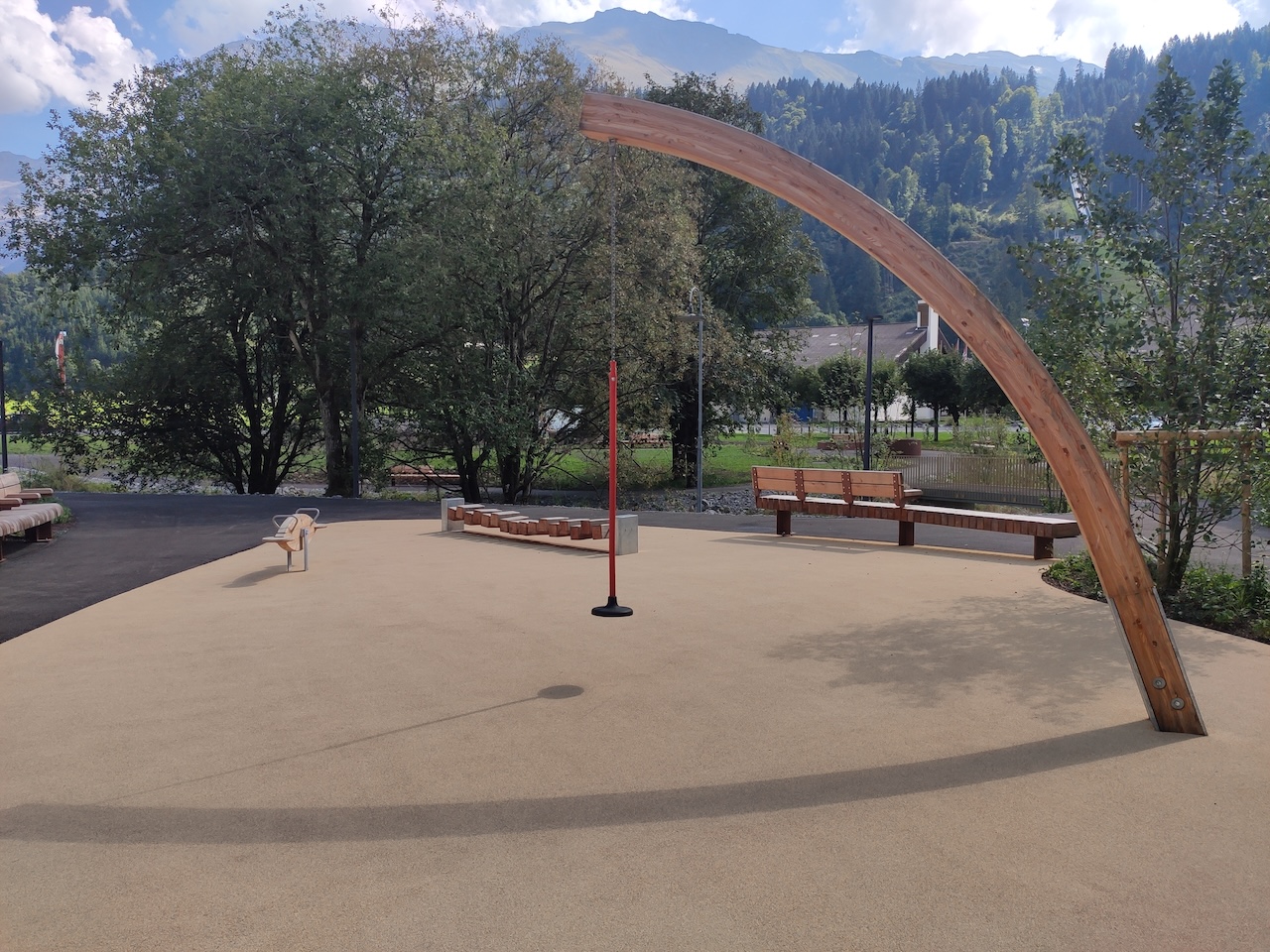 Trave in legno lamellare in larice non impregnato, incollata secondo la norma EN 14080:2013, per sezioni di legno molto grandi. Giunto cardanico, zincato a caldo, composto da due cuscinetti a strisciamento in metallo sinterizzato, permette di oscillare liberamente in tutte le direzioni. Collegamento a fune girevole. Movimenti avanti e indietro con cuscinetti a strisciamento in metallo sinterizzato, autolubrificanti. Disco profilato per una distribuzione ottimale della pressione e una protezione contro le infiltrazioni d'acqua. Sedile girevole con bordo paracolpi morbido e inserto in acciaio. Catene in acciaio zincato a caldo (V2A / V4A con sovrapprezzo) saldate prima della zincatura, a maglia corta, senza occhielli sulle parti di collegamento, facili da sostituire e accorciare.