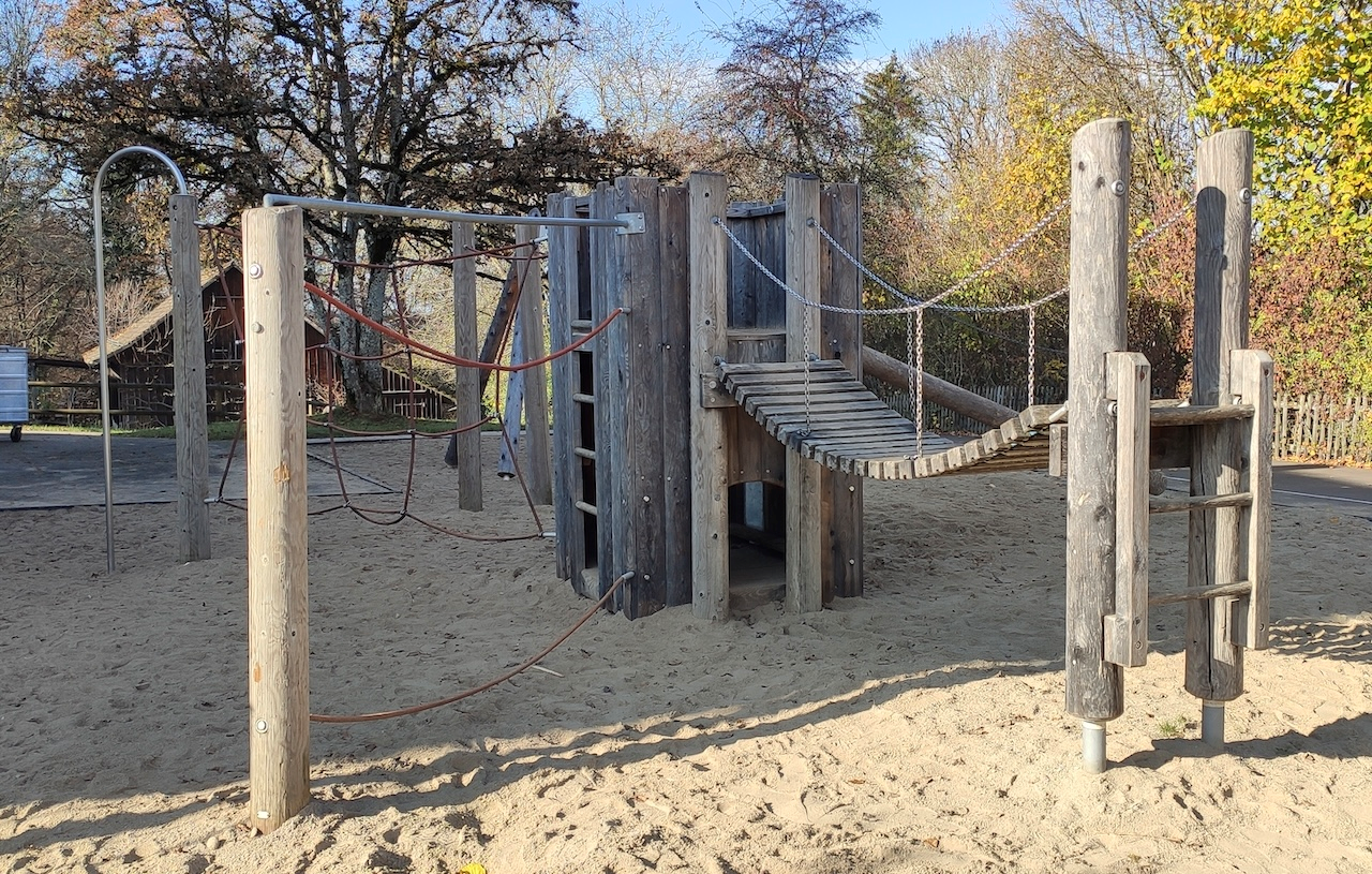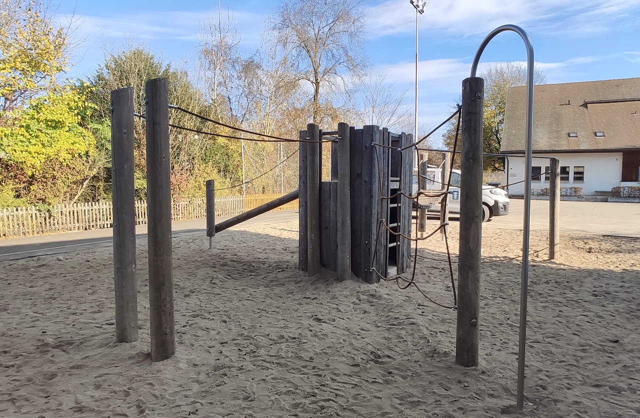 Appliance made from non-impregnated mountain larch, sawn timber heart-cut. Rinds (4-5 cm) white-peeled by hand, natural tree surface remains tangible and tactile. Climbing rungs made of hardwood (ash) Ø 4.2 cm, milled, mortised, secured against twisting. Richter-Herkul rope, Ø > 20 mm, made of galvanised six-strand steel cables, covered and bonded with polyester yarn, with very good abrasion resistance, firm hold of the sheathing even in the event of punctual damage. S-connector, Ø 8.1 mm, made of high-quality stainless steel, rounded.