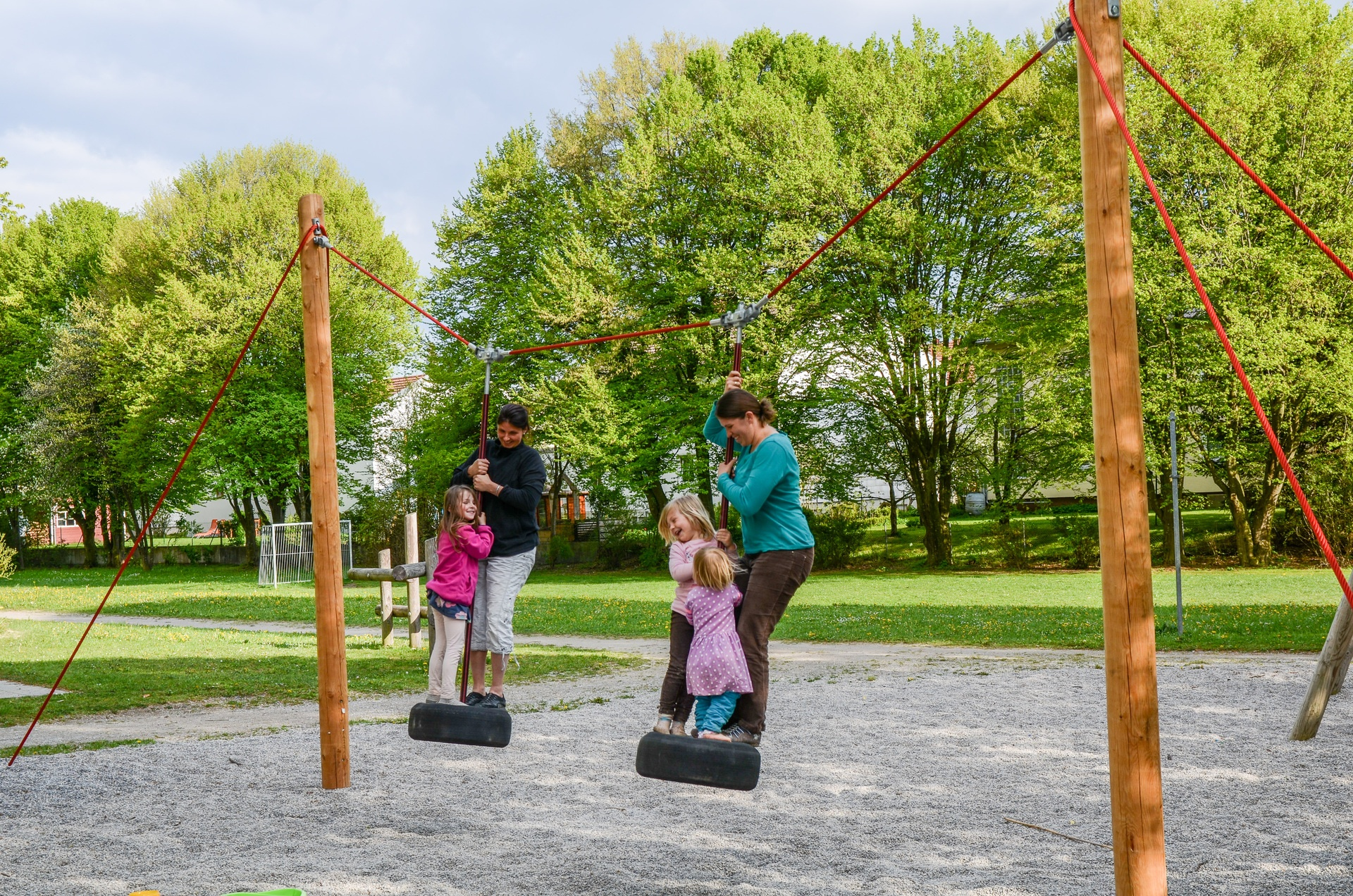 Gerät aus nicht imprägnierter Gebirgslärche, Palisaden weissgeschält, mit schrägem Hirnholzabschnitt (Holzschutzmassnahme). Richter-Herkulesseil, Ø > 20 mm, aus verzinkten sechslitzigen Stahlseilen, umlegt und verklebt mit Polyestergarn, mit sehr guter Abriebbeständigkeit, fester Halt der Ummantelung auch bei punktueller Beschädigung. Kardangelenk, feuerverzinkt, besteht aus zwei Sintermetallgleitlagern, ermöglicht freies Schwingen in alle Richtungen. Hin- und Herbewegungen mit Sintermetallgleitlager, selbstschmierend. Pendelreifen an schlauchüberzogenen Griffstangen aufgehängt. Standardseilfarbe: rot